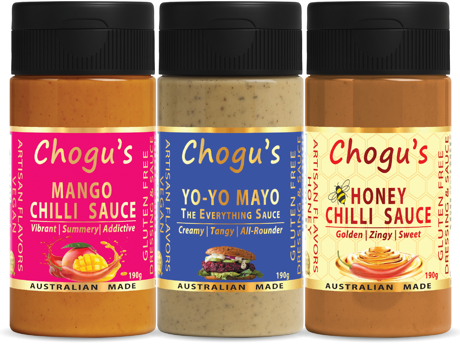Perfect for drizzling, dipping, marinating or spreading. Use them on wings, burgers, tacos, salads, bowls, grilled meats, snacks and everything in between. Whether you’re upgrading your pantry or gifting a flavour lover, this Trio is the easiest way to add instant Chogu’s magic to any meal.